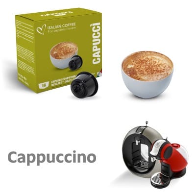 Co je to cappuccino? Jedná se o kombinaci lahodné kávy a napěněného mléka. Kdo měl možnost alespoň jednou pít tento jedinečný nápoj, bude tuto chuť jistě hledat znovu. Kapsle kompatibilní se systémem Dolce Gusto® obsahují vybraná kávová zrna. Námi nabízené cappuccino neobsahuje cukr. Kapsle kompatibilní se systémem Dolce Gusto® obsahují pouze přírodní složky. Z jednoho balení si můžete připravit až 16 šálků cappuccina.