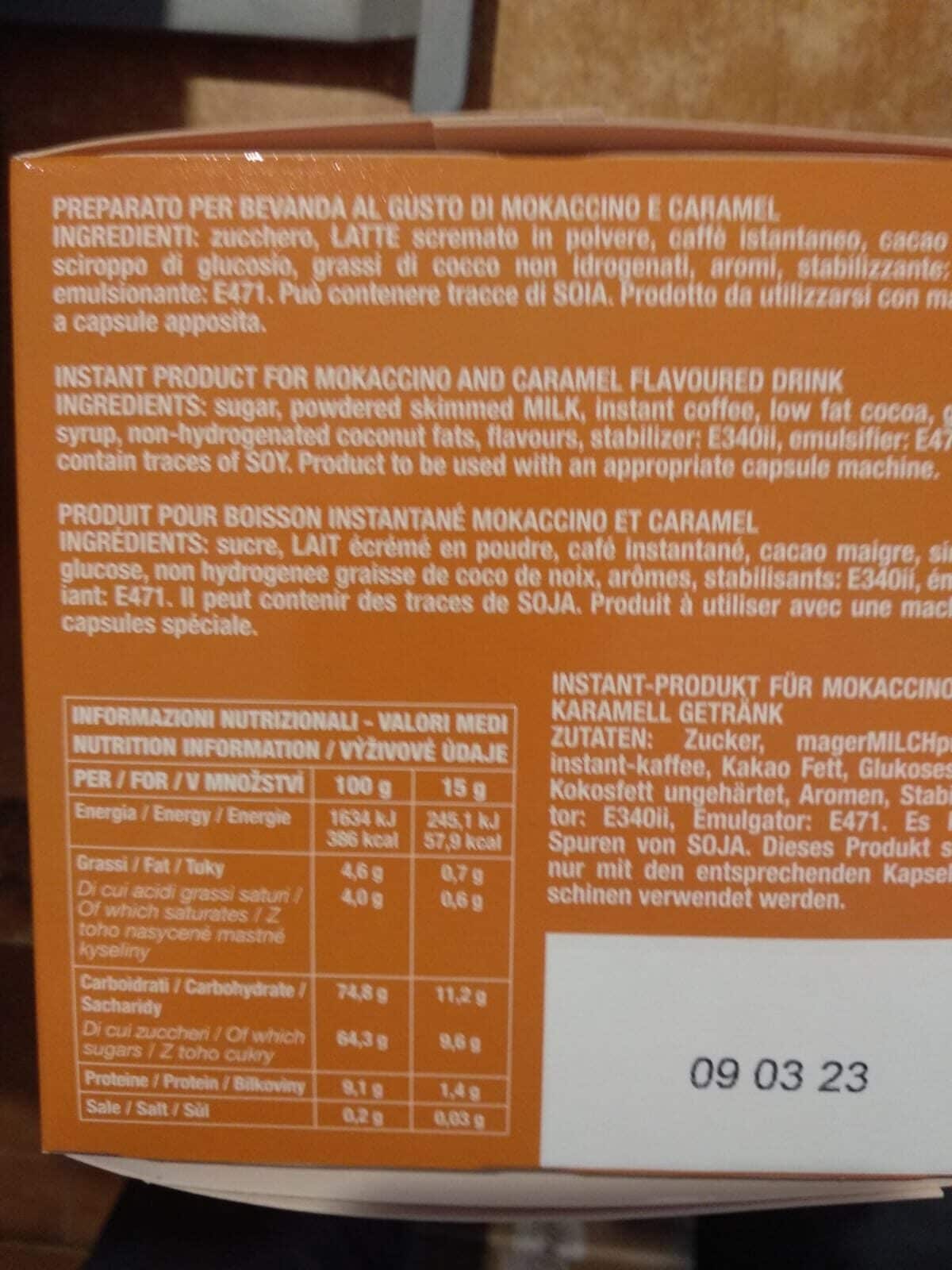 Složení: cukr, sušené odstředěné mléko, instantní káva, odstředěné kakao, glukózový sirup, nehydrogenovaný kokosový olej, aroma, stabilizátor: aE340ii, emulgátor: E471. Může obsahovat stopy sóji.