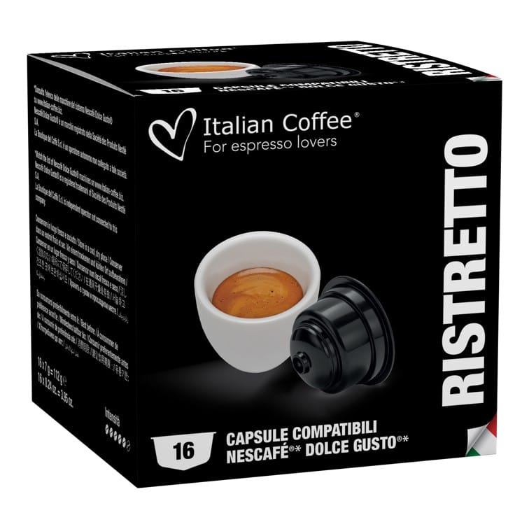 Nescafé Dolce Gusto Ristretto italské kávové kapsle jsou klasická italská pražená káva s bohatou chutí, intenzivním aroma a hustou pěnou. Kapsle kompatibilní se systémem DOLCE GUSTO* ® obsahují 100 % chuti a vůně kávy