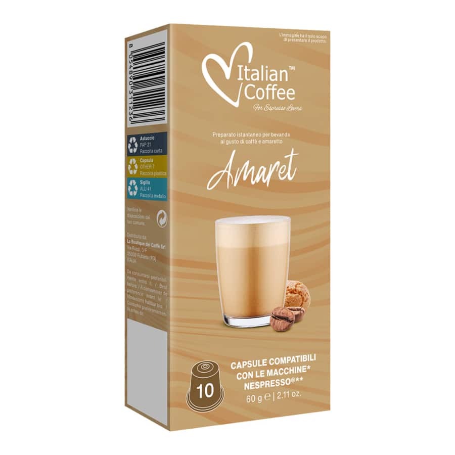 Amaretto je káva s chutí klasického italského alkoholického likéru stejného jména. Směs použitá k přípravě tohoto nálevu má velmi hustou konzistenci. Vyznačuje se také střední intenzitou. Má velmi jemnou vůni. Kapsle Amaretto kompatibilní s® Nespresso obsahují směs Arabiky (30 procent) a Robusty (70 procent). Kávová zrna pocházejí z Ghany, Kolumbie a Vietnamu. Nálev má velmi jemnou chuť s tóny mandlí. Nezbývá nic jiného, než si to užít. Kávový nápoj Amaretto je směs s jemnou, lehce nahořklou chutí a jemnou vůní likéru Amaretto vyrobeného na bázi mandlí. 10 kapslí kompatibilních se systémem Nespresso. Každá porce mleté kávy, určená pro přípravu v kapslových kávovarech Nespresso, je balena do speciálních hermetických kapslí, což vám umožní zachovat plné vlastnosti a kvality kávy i po mnoha měsících, což zaručuje vynikající chuť a aroma.