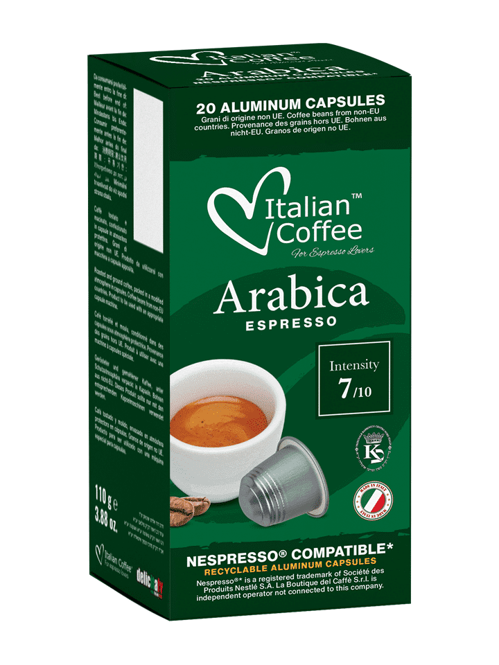 Balení obsahuje 20 hliníkových kapslí s praženou a mletou kávou. Kapsle kompatibilní se systémem Nespresso. Arabica je jednou z nejznámějších a nejcennějších odrůd kávy na světě. Vyznačuje se jemnou, sladkokyselou chutí, pomalu uvolňující tóny kakaa a vanilky. Arabica je také po celém světě ceněna pro svou nízkou hladinu kofeinu a můžete ji pít, kdykoli chcete, dokonce i v pozdním odpoledni. Italskou Arabiku střední intenzity jistě ocení milovníci kávy. Bude ideální pro ranní stimulaci a bude dobře fungovat i během dne. Jedinečná forma kapslí je neuvěřitelně pohodlná a snadno se připravuje.