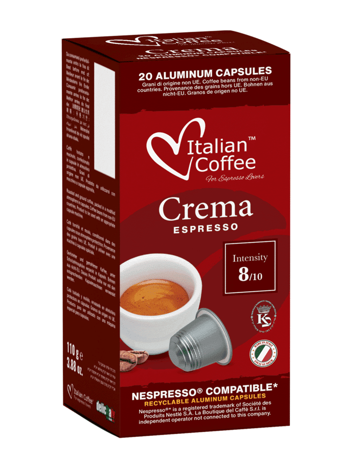 Kolekci 20 hliníkových kapslí s praženou a mletou kávou Crema Espresso si jistě zamilují gurmáni intenzivní kávy. Jemná italská káva Crema Espresso je perfektní jako dobrý nápoj po ránu. Káva byla připravena z pečlivě vybraných kávových zrn pod dohledem mistrů. Kapsle kompatibilní se systémem Nespresso. Italská káva Crema Espresso je směsí kvalitní Arabiky a Robusty. Tato kombinace nám dává plnou chuť s vysokou intenzitou. Káva je perfektní ráno pro dobrý start do nového dne.