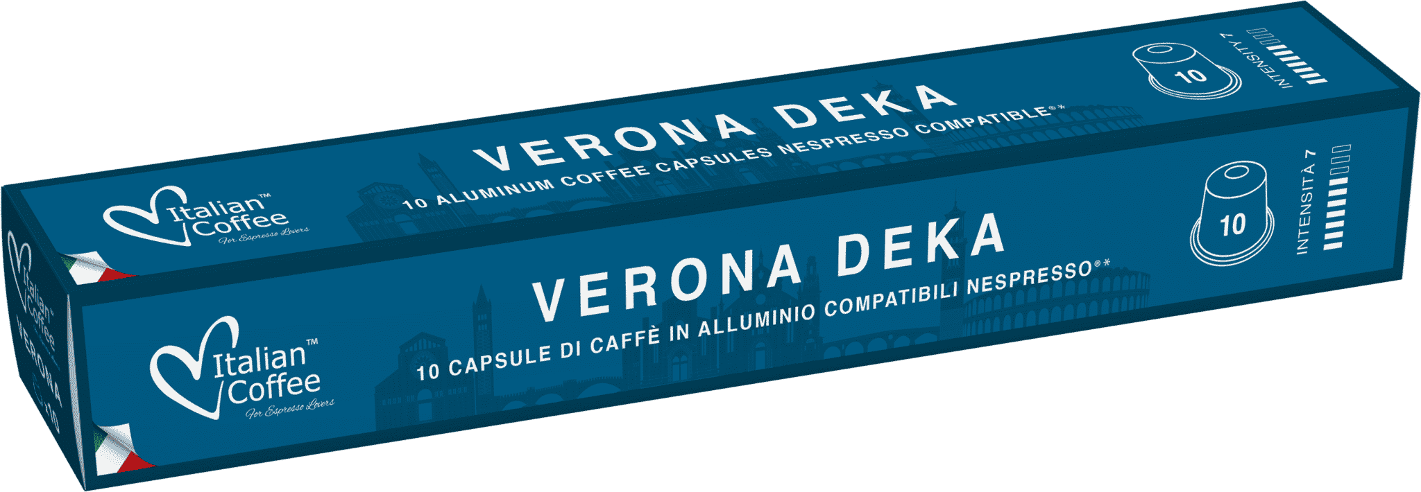 Itálie je spojena se sluncem, radostí a výbornou kávou. Tentokrát vám představujeme směs fazolí, která odkazuje na jedno z nejznámějších měst, Veronu. Verona je italské město, do kterého milovníci rádi chodí. Obdivují mimo jiné Juliin dům a balkon z dramatu Williama Shakespeara. Pokud i vy chcete na chvíli pocítit jedinečnou atmosféru Verony, doporučujeme vám kávu inspirovanou tímto místem. Určitě si oblíbíte její harmonickou chuť a jemnou vůni. V její vůni jsou cítit jemné tóny spáleného dřeva. Kapsle jsou kompatibilní se systémem Nespresso®. Po napaření se na povrchu vytvoří hustá a krémová pěna. Doporučujeme vám to vyzkoušet! Kávové kapsle Verona se vyznačují hedvábnou sladkostí chuti v kombinaci s pomalu uvolňovanými tóny praženého dřeva. Jedná se o vyváženou směs nejvyšší kvality, ušlechtilé chuťové odrůdy kávových zrn s těmi, které jí dodávají charakter. Směs Verona je bez kofeinu, takže ji mohou užívat i lidé, kteří z nějakého důvodu nemohou pít tradiční kofeinovou kávu.